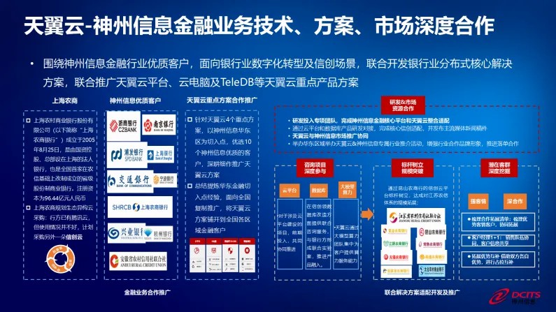 在金融云解决方案的推广上,神州信息和天翼云携手实现了对银行云、非银金融云、金融监管云等多个领域的全面覆盖。神州信息融信云凭借30年、400多家金融机构的深厚经验,解决方案的成熟度和市场认可度成为双方合作的重要基础;而天翼金融云丰富的云服务产品及国家级的安全保障体系,又为合作的顺利开展提供了重要保障。