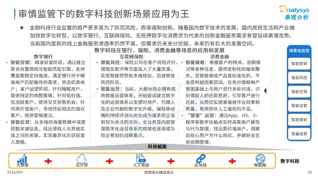 以大数据、人工智能、物联网、区块链等为代表的数字科技驱动金融产业数字化方兴未艾,数字科技使得金融和科技两个领域产生更紧密的场景联结,使得数字科技服务可以更早、更有效地介入到金融产业增长模型中去,更早的融入到企业和个人的资产生成过程,并从根本上提升金融机构资产透视能力和资产定价能力,帮助金融机构和实体部门降低成本、提升效率、增强用户体验及优化业务模式。